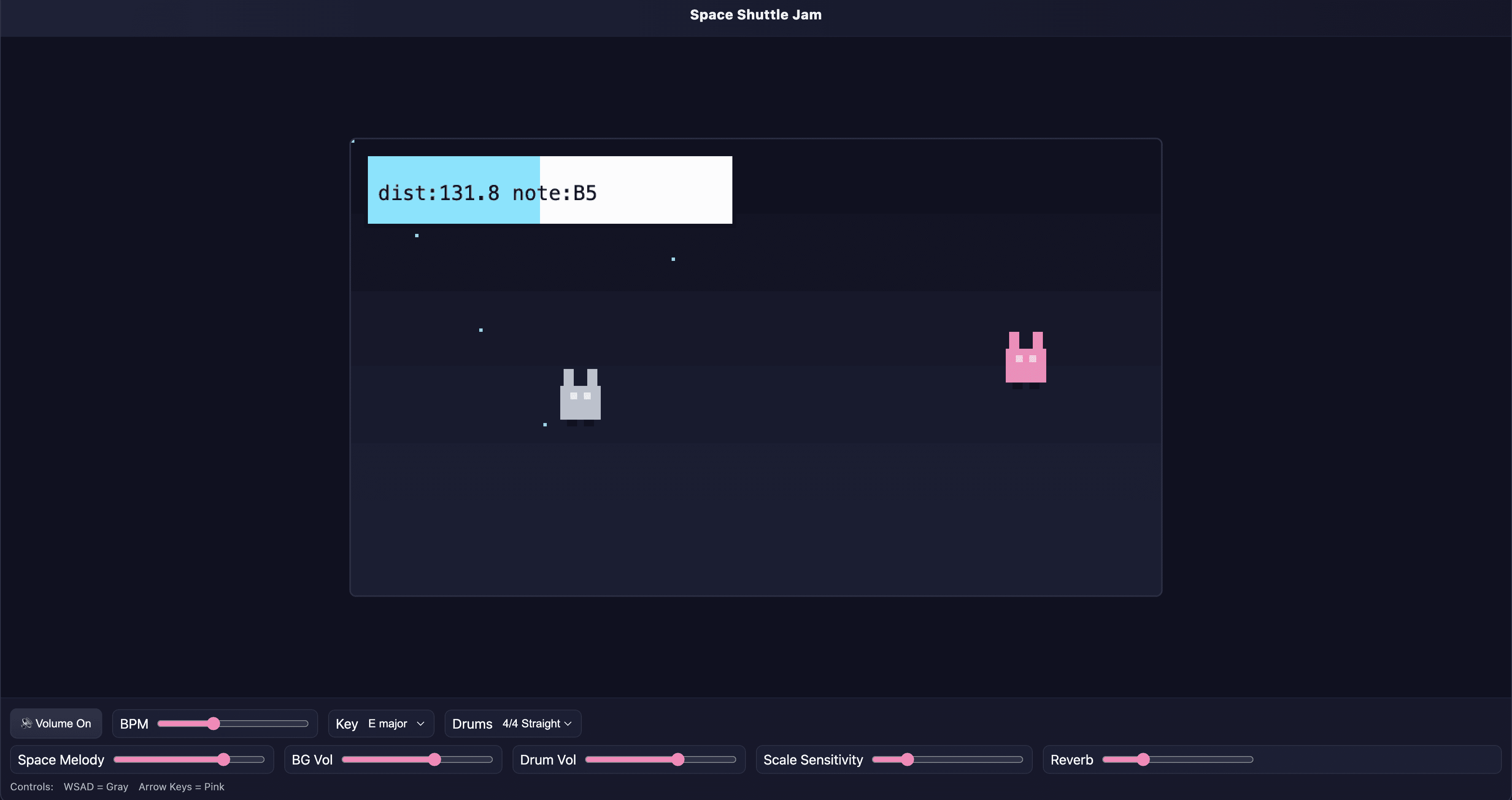 Space Shuttle Jam is a multiplayer musical interface I built through vibe coding with Cursor, designed as a playful way to explore collaborative sound-making. Users start by selecting a key, which sets the background music to a 12-bar blues progression in that tonality. Two players then control characters in the scene using WSAD and the arrow keys, and the distance between the characters dynamically maps to notes on the blues scale, turning movement into a live jamming experience.